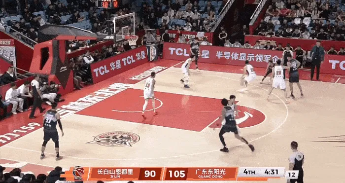 姜伟泽在末节比赛中使出超远距离双后撤步,再接上下步抛投打进,裁判未吹罚走步违例。