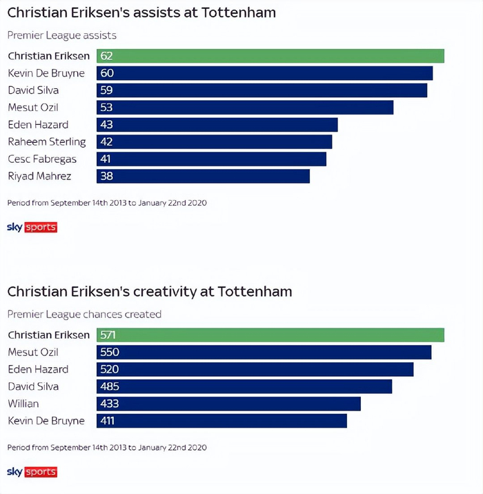 在热刺的巅峰时期,埃里克森不仅做到了这些,还展现了更多——他堪称英超联赛中最出色的创造力源泉。这样的说法看似大胆,但数据足以佐证:在热刺效力期间,这位丹麦中场的助攻数和创造机会数均位居联赛第一,同期禁区外进球数也超过了其他任何英超球员。